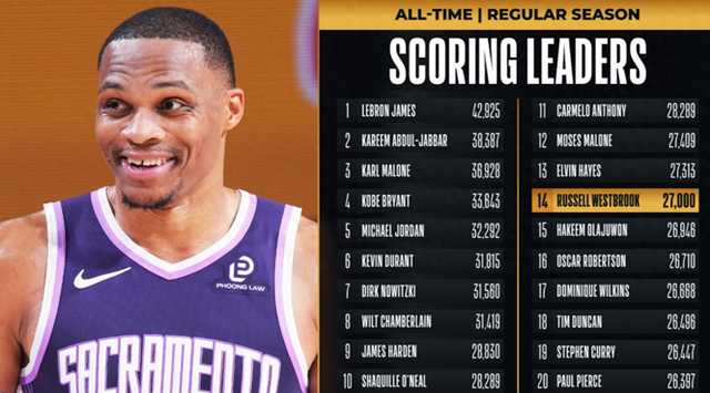 虽然遭遇了13连败,不过威少还是迎来了里程碑时刻,在拿到这17分之后,威少的职业生涯总得分,就成功突破了27000分大关,他也成为历史得分榜第14位的大神。作为一个超级控卫,威少的表现极其出色,37岁的年龄,还有机会去冲击历史前十。